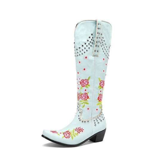Women's Western Mid-Calf Boots with Retro Floral Embroidered Rivets and Multi-colours with Pointed Toe