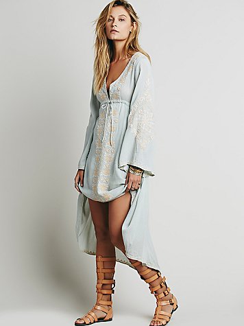 Boho/ Vintage Tunic Style Long Sleeve Dress with Floral Embroidered Cotton and Asymmetric Robe