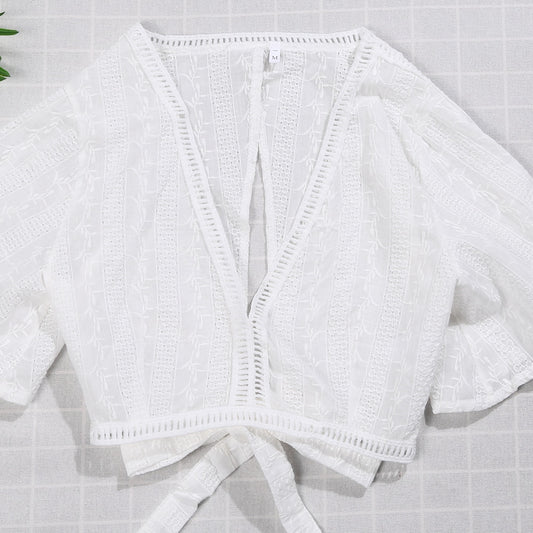 Boho Summer Short Sleeve Blouse with Cover Up Sleeves, Low Cut V-Neck and Midriff Waistline