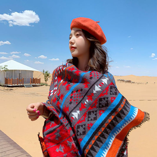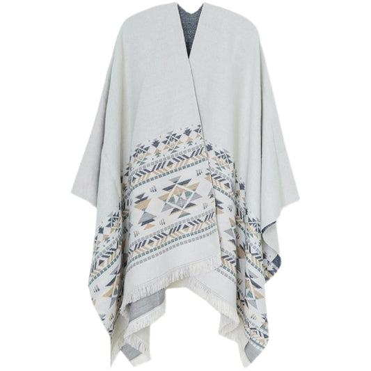 Winter Knitted Bohemian Printed Poncho with Tasselled Cape