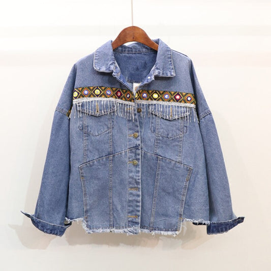 Winter Gypsy/Boho Floral Embroidered Denim Jacket with Embellishments and Tassels