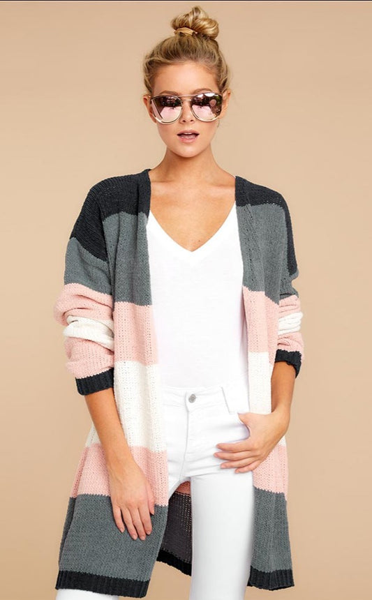 Winter Knitted Patchwork Rainbow Stripe Cardigan with Long Sleeves and Open Front