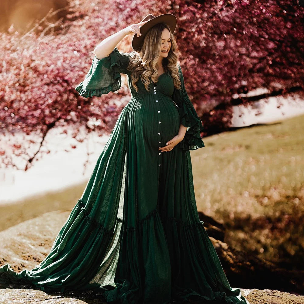 A. Linen Cotton Floor Mopping Bohemian Maternity Dress With Hem Flounce Edges. Photography or Baby Shower Dress