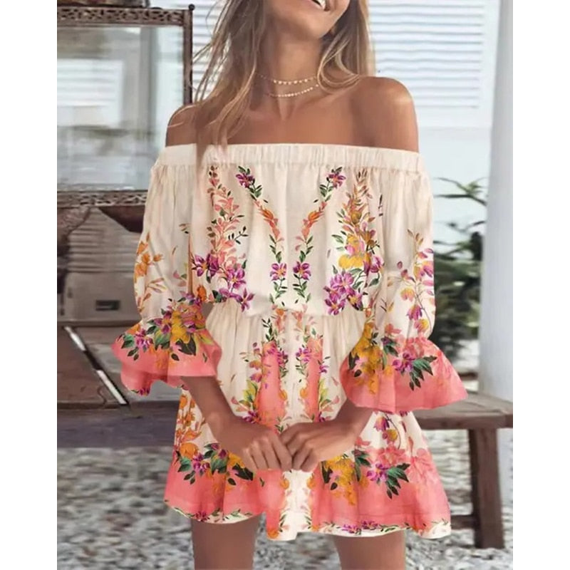 Boho Off The Shoulder Floral, Lace-Up Tunic Style Dress with Flare Batwing Sleeve
