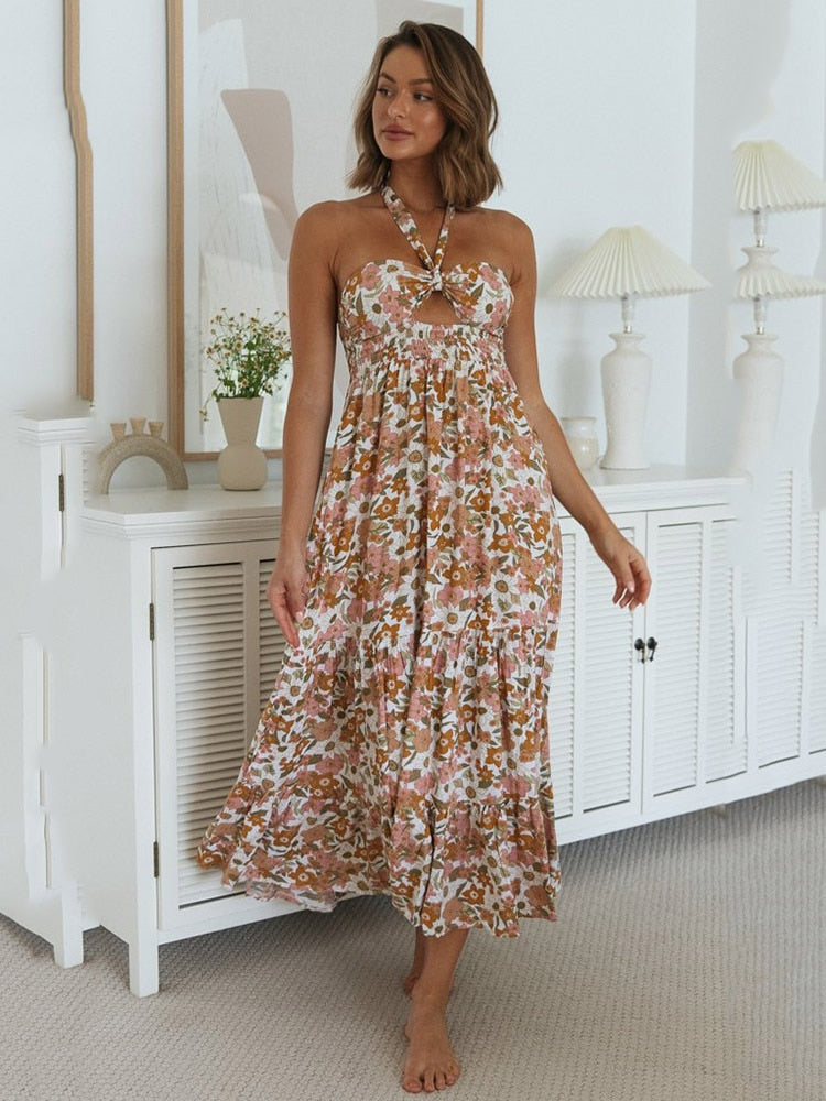 Boho/ Vintage Style Halter Plaid Party Dress with High Waist and Backless Beach Style