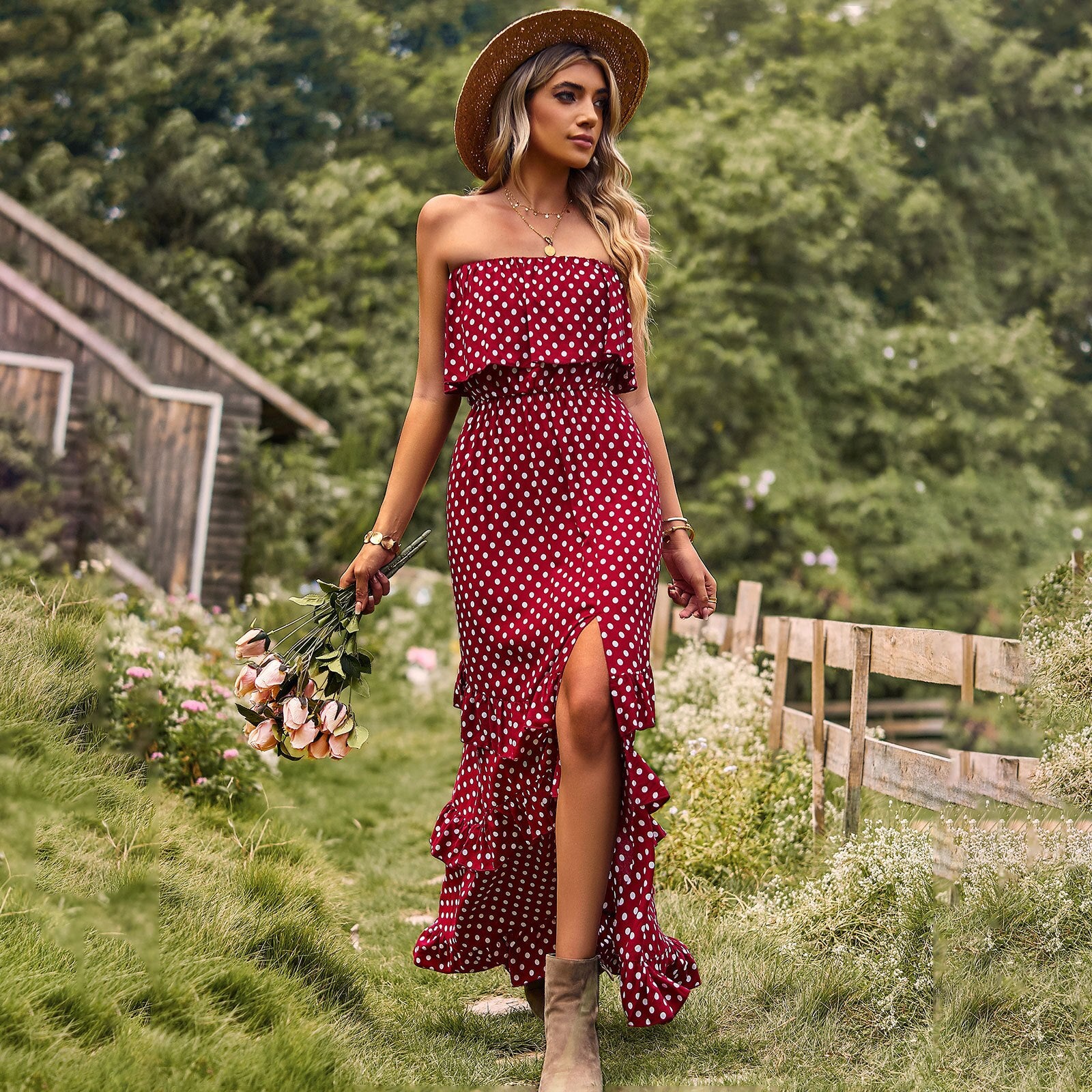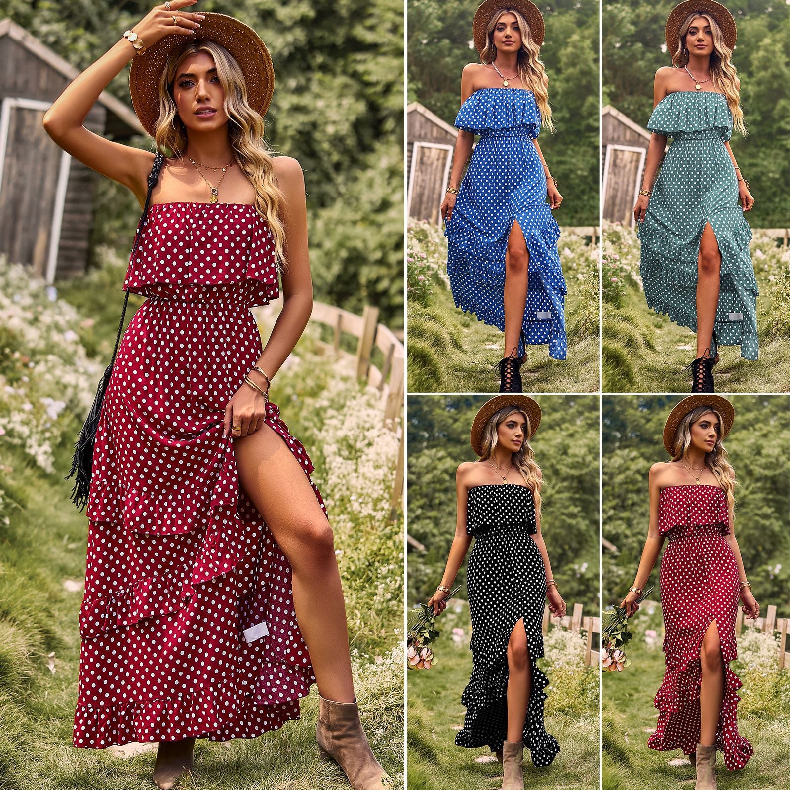 Boho Polka Dot Printed Women's Off the Shoulder Sleeveless Sundress with Split